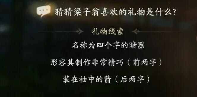 3、礼物线索:名称为四个字的暗器;形容其制作非常精巧(前两字),装在袖中的箭(后两字)。