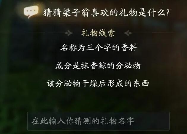 2、礼物线索:名称为三个字的香料;成分是抹香鲸的分泌物,该分泌物干燥后形成的东西。