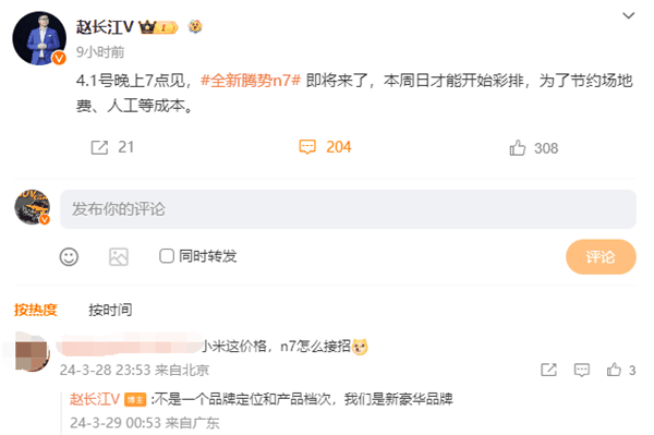 腾势销售事业部总经理在回答网友“小米这价格,N7怎么接招”时回应称:不是一个品牌定位和产品档次,我们是新豪华品牌。