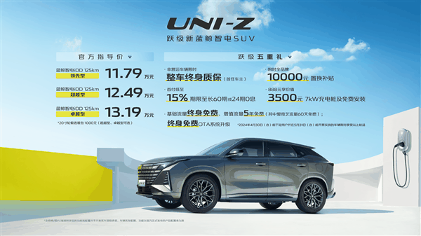 叮当号3月29日消息,近日,长安全新插电混动SUV车型UNI-Z正式上市,新车共推出3款配置,售价区间为11.79-13.19万元,现在购车可享受五重跃级大礼。