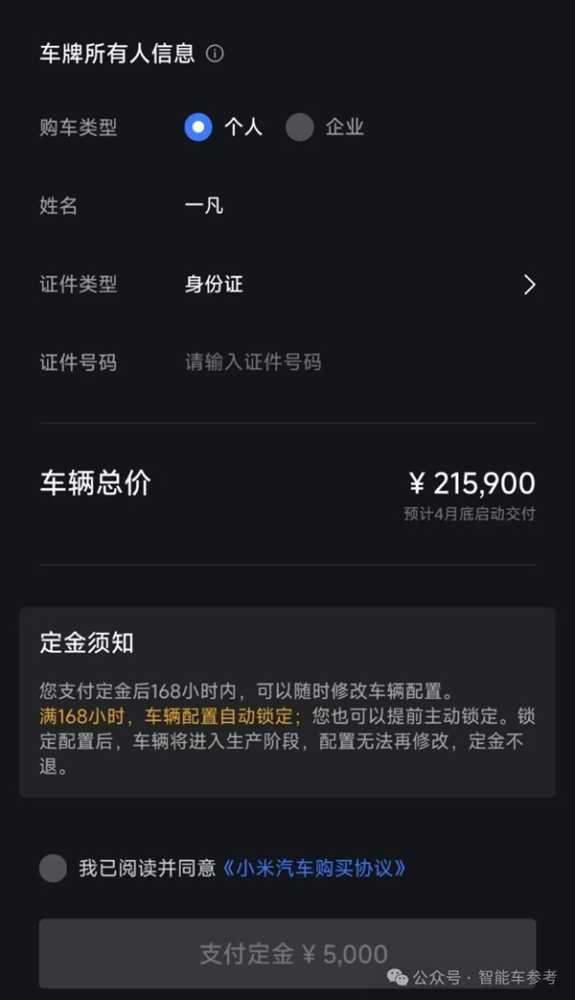 而过去车企的大定,是不能退钱的,所以小米这个应该叫小定。