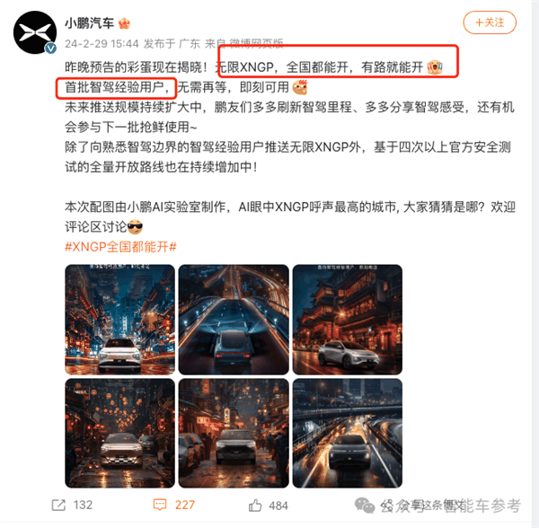 华为ADS2.0「全国都能开」开放后,小鹏率先跟进,在2月29日宣布「全国都能开」,不过先期也是开放给部分用户。