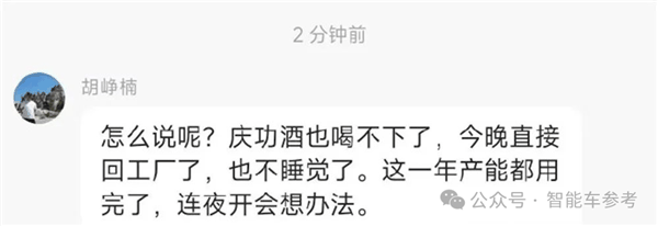 小米从吉利挖来的造车高管胡峥楠更是直接表态,一年的产能都被用光了,庆功酒也喝不下,连夜回工厂加班了。