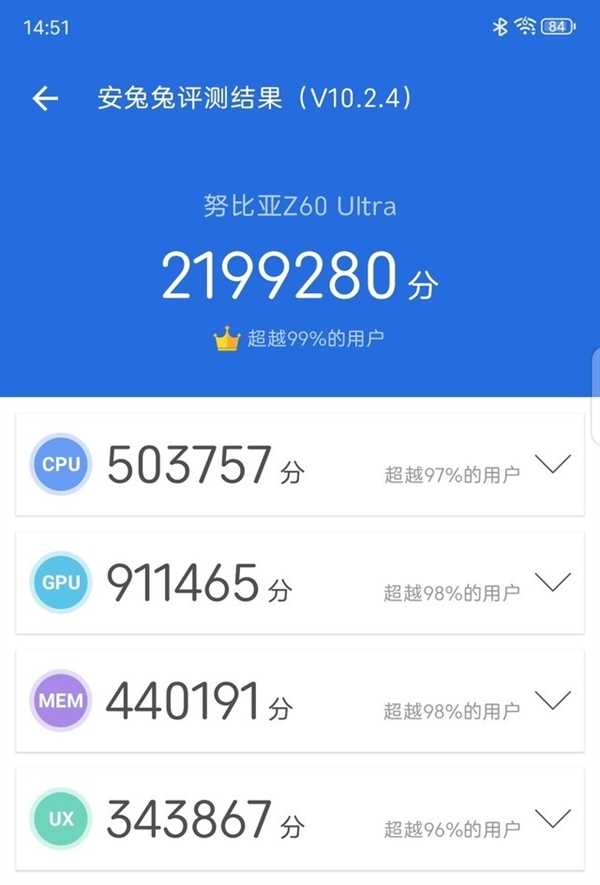 努比亚Z60 Ultra摄影师版在性能上同样表现出色,它搭载了高通骁龙8 Gen3和UFS4.0与LPDDR5X的高效内存组合,无论是处理日常任务还是运行高要求的游戏,都能提供流畅的用户体验。根据安兔兔的测试,该手机跑分高达219万,彰显了其卓越的性能。