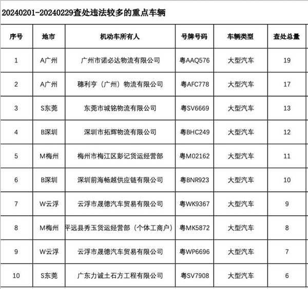 违法较多的重点车辆包括广州市诺必达物流有限公司的粤AAQ576、穗利亨(广州)物流有限公司的粤AFC778等10辆,其中粤AAQ576违法总量达19次。