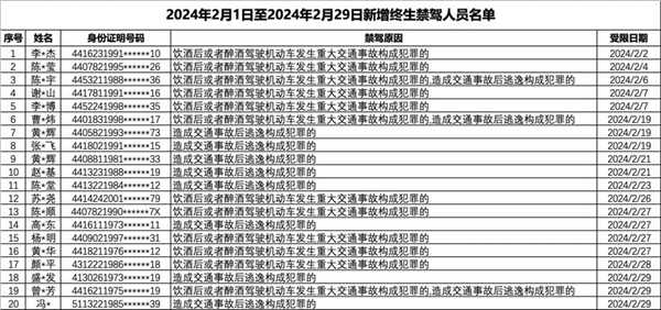 2月份新增20名终生禁驾人员里,8人因造成交通事故后逃逸构成犯罪被终生禁驾,9人属于饮酒或醉酒驾驶机动车发生重大交通事故构成犯罪被终生禁驾,3人属于饮酒或醉酒驾驶机动车造成重大交通事故后逃逸构成犯罪被终生禁驾,持有AB证的驾驶人有1人。
