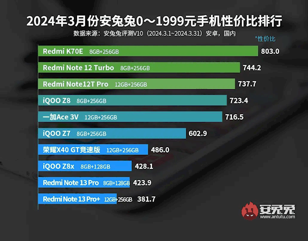 叮当号4月2日消息,今晚,安兔兔发布了2024年3月安卓手机性价比榜,Redmi系列表现抢眼,成为关注焦点。