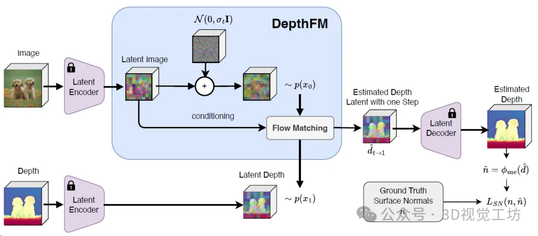 训练Pipeline。 训练受到流匹配和表面法向损失的限制:对于流匹配,使用数据依赖的流匹配来回归地面真实深度与对应图像之间的向量场。此外,通过一个表面法向损失来实现几何真实感。