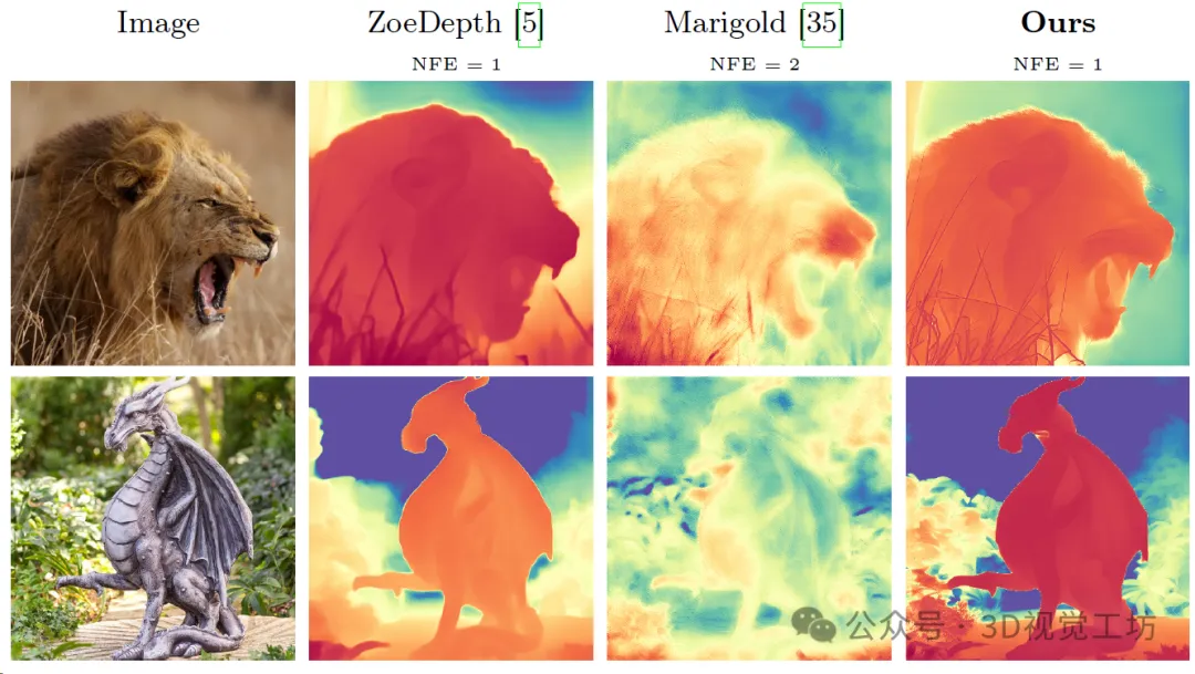 (3)表明,流匹配模型高效,并能在单个推理步骤内合成深度图。