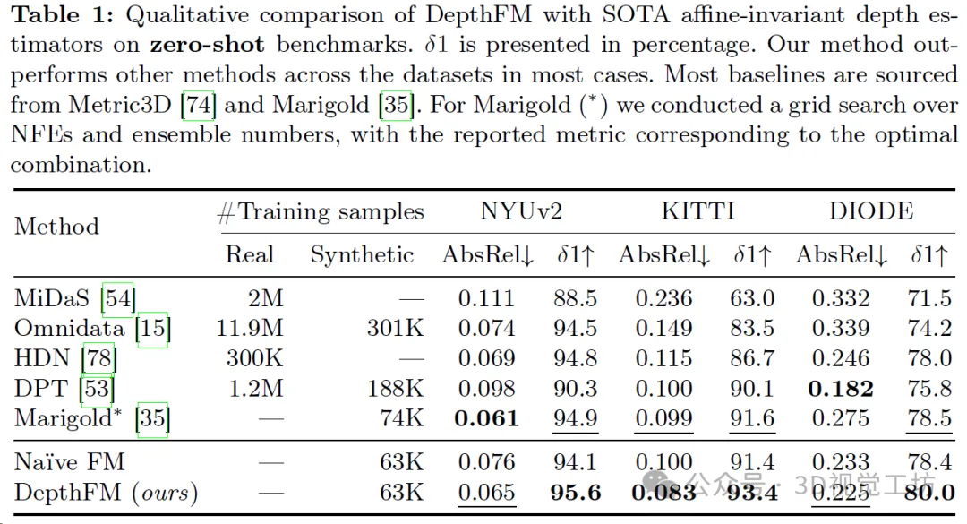 DepthFM通过仅在63k纯合成样本上进行训练展现出了显著的泛化能力,并且能够在室内外数据集上进行零-shot深度估计。表1定性地展示了DepthFM与最先进的对应模型的性能对比。虽然其他模型通常依赖于大量数据集进行训练,但DepthFM利用了基于扩散的基础模型中固有的丰富知识。这种方法不仅节省了计算资源,而且强调了模型的适应性和训练效率。