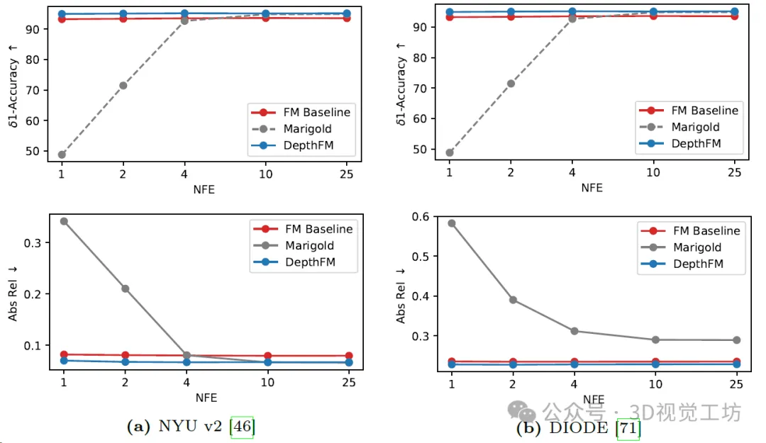 对基于扩散的Marigold深度估计、流匹配(FM)基准和DepthFM模型进行比较。每种方法仅使用一个集合成员进行评估,并针对两个常见基准数据集进行不同数量的函数评估(NFE)。与FM基准相比,DepthFM集成了训练过程中的法线损失和数据相关的耦合。