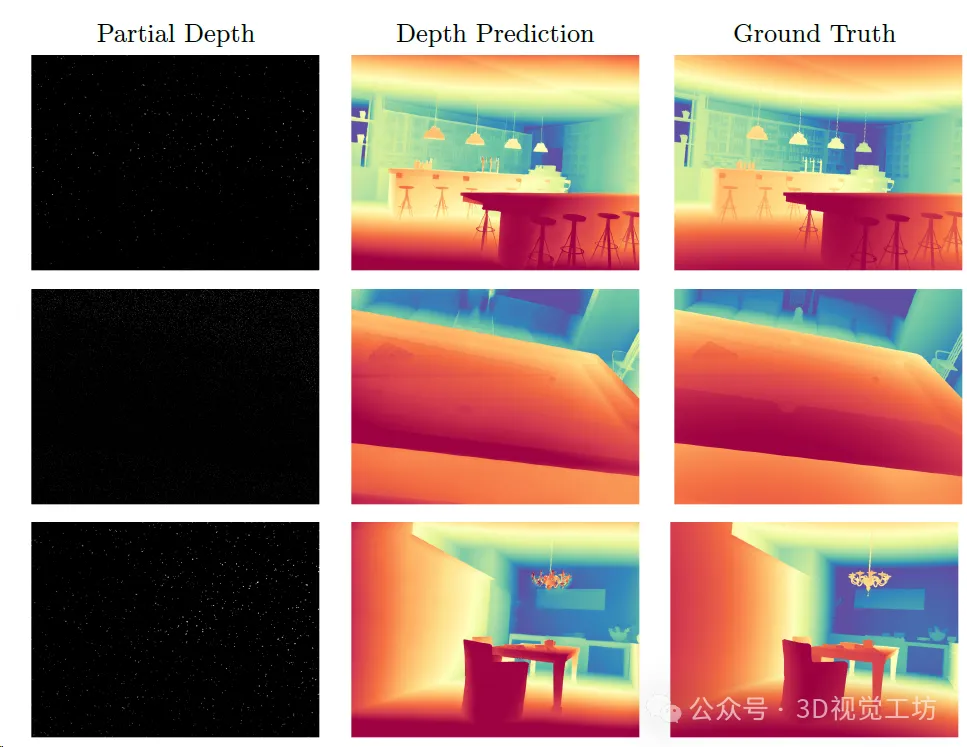 在Hypersim上进行深度补全。左:给予部分深度。中:深度估计从给定的部分深度。右:真值深度。