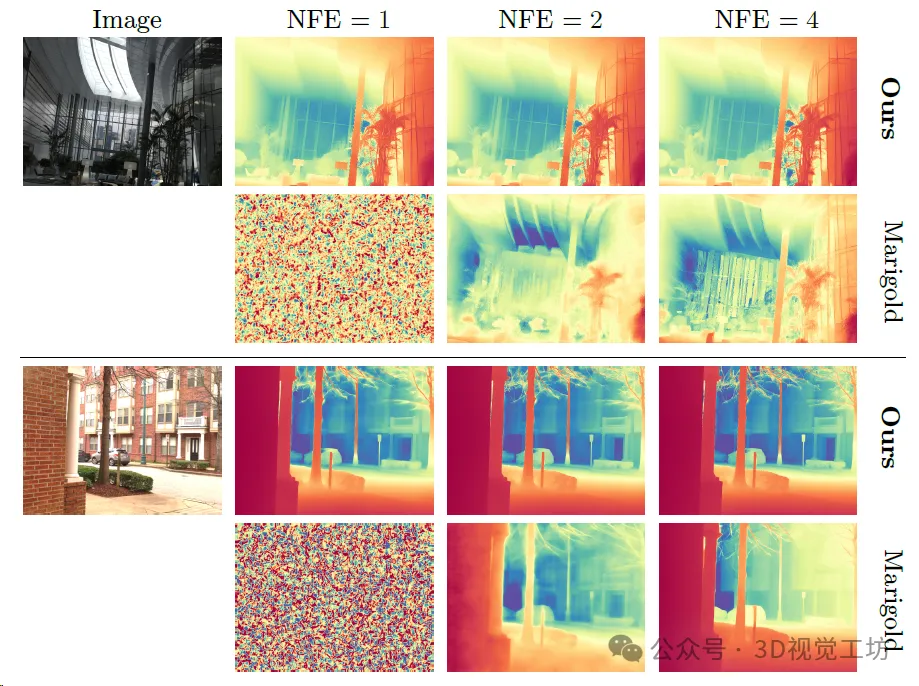 对于Marigold和的DepthFM模型在不同数量的功能评估中的定性结果。值得注意的是,通过一步推断,Marigold并没有给出任何有意义的结果,而DepthFM的结果已经显示了真实的深度图。