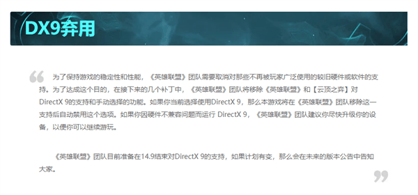 如果玩家当前选择使用DirectX 9,那么游戏将在《英雄联盟》团队移除这一支持后自动禁用这个选项。