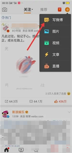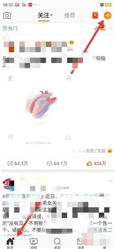 1、首先我们打开手机微博,点击首页右上角如图所示的+号图标。