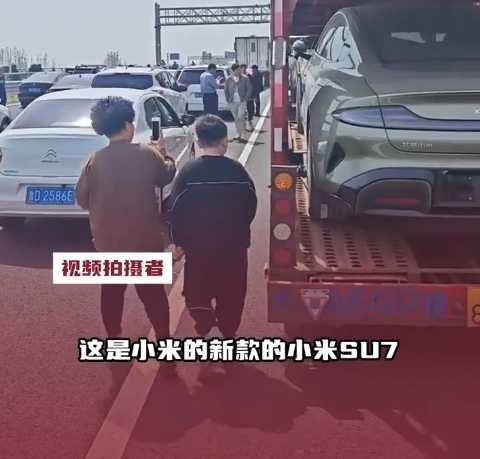 视频中,因高速堵车一辆运输小米SU7的板车成了路上最靓的仔,吸引了男女老少一大波人围观,大家纷纷拿出手机拍照,仿佛身处4S店展厅一般。