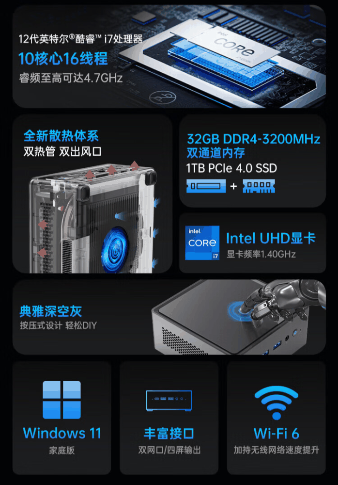 该迷你主机搭载第 12 代英特尔酷睿 i7-12650H 处理器,10 核(6P + 4E)16 线程,最高睿频 4.7GHz,双 SO-DIMM 内存插槽,预装 32GB DDR4 3200 内存与 1TB PCIe 4.0 固态硬盘。