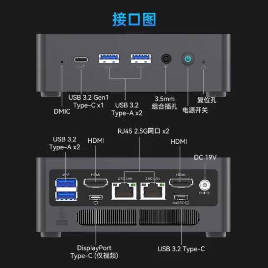 后置:两个 USB 3.2 Type-A、USB 3.2 Type-C、两个 HDMI、DisplayPort Type-C、两个 2.5G 网口、DC 电源输入