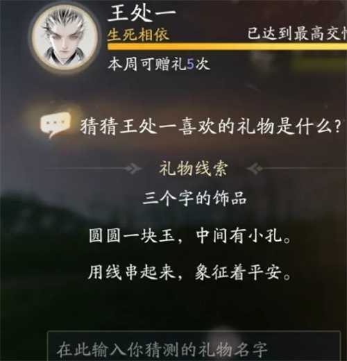 3、礼物线索:三个字的饰品,圆圆一块玉,中间有小孔。用线串起来,象征着平安。