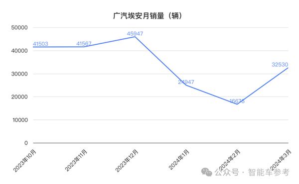 今年一季度,埃安累计销量为7.4万辆,同比减少11.98%,单月销量来到2万-3万辆左右,2月更是跌破2万辆,仅1.67万辆。