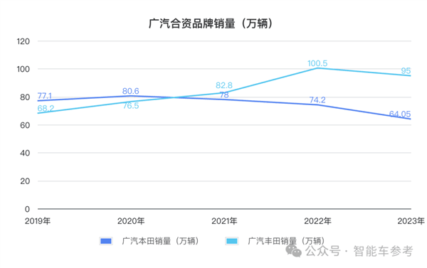 广汽本田2023年销量为64.05万辆,比2022年下降13.6%,已经是连续四年下滑;广汽丰田2023年销量跌破百万辆,达到95万辆,减少5.47%。