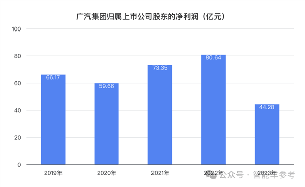 2023年广汽集团归属上市公司股东的净利润为44.29亿元,比2022年减少45.08%,是2020年以来净利润首次下跌,规模逼近2015年的39.67亿元。