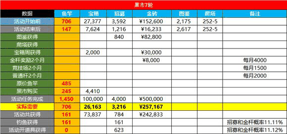 当然,这是讨论的50+1600,也就是99档完成的情况,要是脸最黑,那就进场前多买140杆就行了,用不完就留着下次嫖金鱼用,或者金砖消耗买别的,干别的,如果元旦是黑市周开消耗,那0氪选择稍微多了一些。
