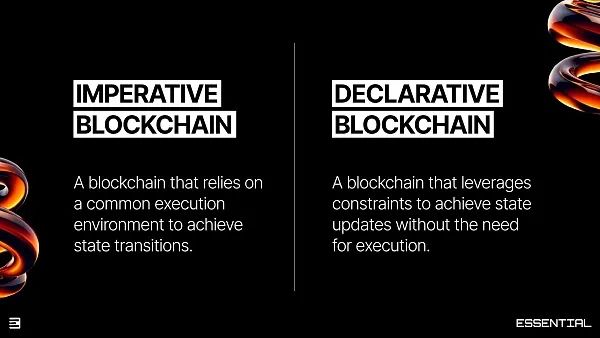 Essential 认为,自第一个通用区块链以太坊诞生以来,每个通用区块链都使用了命令式编程模型,由于它们依赖于代码的线性执行来实现状态更新,因此用户与这些区块链交互的唯一方法是通过命令式指令(例如交易和智能合约)。的确,Web3 新用户对区块链最常见的用户体验批评无外乎就是不确定的结果、失败的交易、MEV、高滑点——实际上它们都是对底层命令式模型的批评。