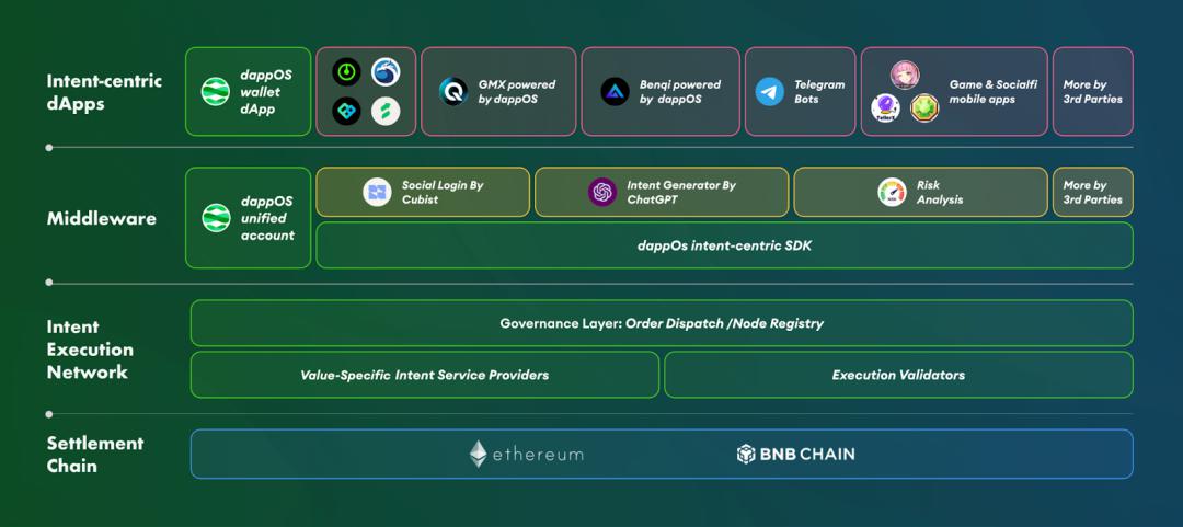 与此同时 dappOS 还提供了与该网络兼容的中间件,开发者能够低成本的将这套“意图”能力向更多 dApps 拓展,并保持去中心化特性。因此,dappOS 正在推动所集成 dApps 到“去中心化意图应用”的凡是转变。