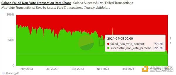 6、事实上,自去年 11 月以来,Solana 的交易失败率一直保持在 50% 左右。如果你回顾一下我上面列出的失败与成功图表,你会发现之前也很类似。