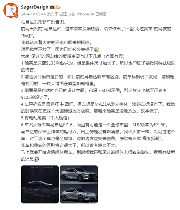 6、车名大概率叫马自达EZ-6,而且有可能是一个全球车型,SUV版本为EZ-60。