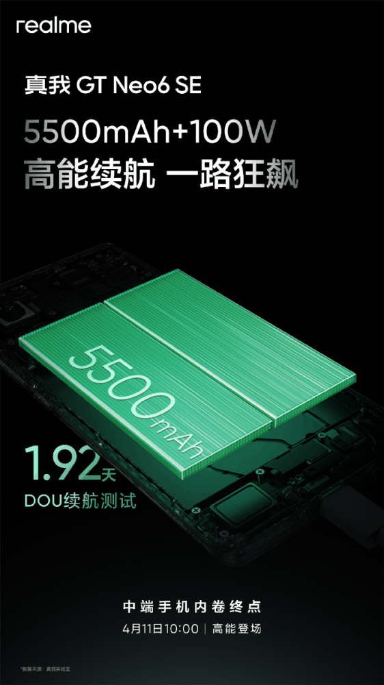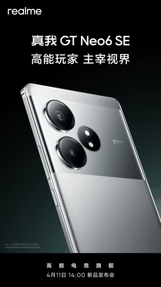 4 月 10 日消息,真我 GT Neo6 SE 手机将在明天 10:00 发布。真我 realme 副总裁、全球营销总裁、中国区总裁徐起继续在微博上为新机预热,此次预热的重点为拍照和续航。