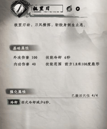 基础属性:外攻伤害 100,内功伤害 40,技能冷却 12秒,技能范围 前方1.8米100度扇形