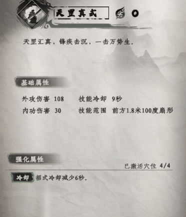 基础属性:外攻伤害 108,内功伤害 30,技能冷却 15秒,技能范围 前方1.8米100度扇形
