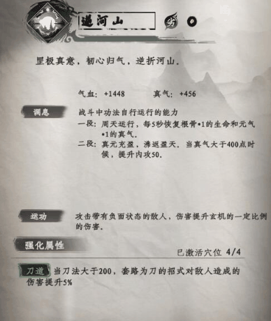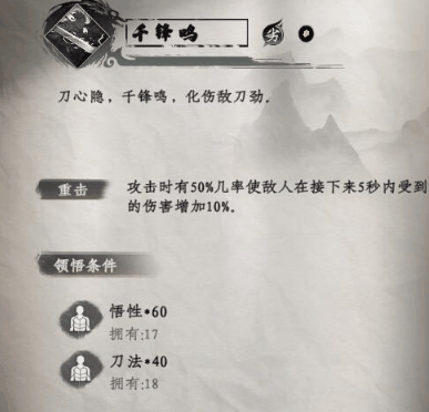 刀道:当刀法大于200时,提升刀法招式伤害5%。