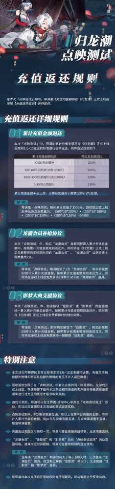 「点映测试」为限量计费删档测试,测试期间,游戏将开放付费功能,各位导演累计充值的金额将在《归龙潮》正式上线后,按照图中公示的规则进行返利。