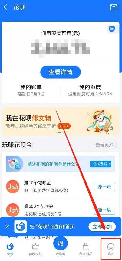 2、进入花呗页面后,继续点击右下方【我的】页面。