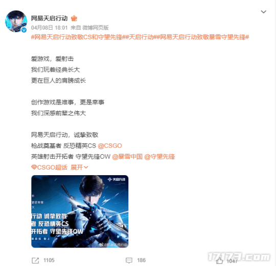 在不久前的4月8日,《天启行动》官微发了一条致敬《反恐精英》与《守望先锋》的微博,官方那谦逊的态度不仅引得各大战队的一阵赞美,其致敬守望的行为更是让人直呼“要变天了”!