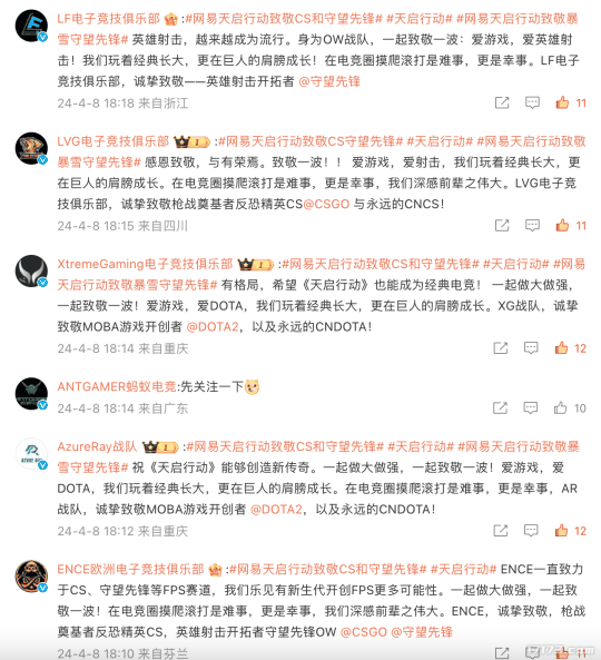 网易官方的致敬之举一石激起千层浪,《CS:GO》和《守望先锋》的各大职业战队纷纷在评论区以“真心换真心”的方式向《天启行动》送来了祝福。
