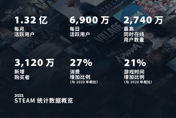 不过在 2021 年,双方都统计了当年的最高同时在线人数, Epic 为 1320 万人,而 Steam 为 2740 万人。