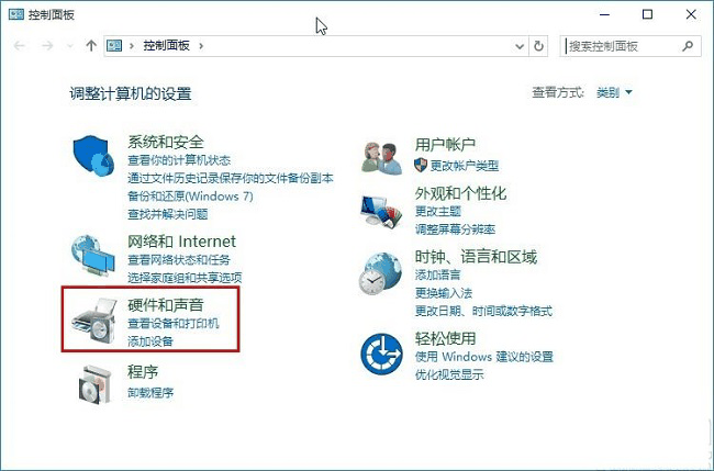 2、进入控制面板后,点击”硬件和声音”选项。