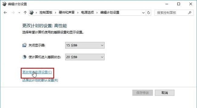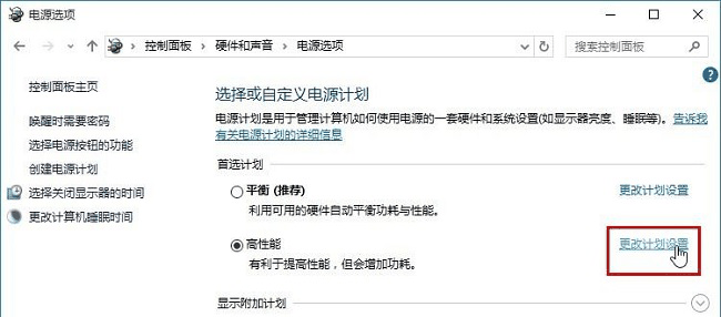 4、再点击”高性能”右侧的”更改计划设置”按钮。