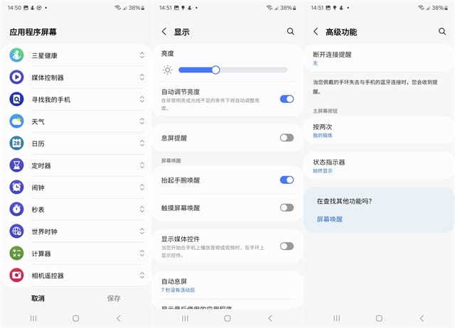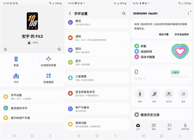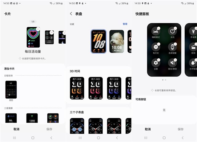 并且在个性化设置方面,三星Galaxy Fit3做的比较到位,除了超多的表盘可以选择外,像是快捷菜单这样的功能,都可以在手机APP上进行设置,这还是比较新颖和人性化的,能够让用户随心去设置,符合自己的习惯。还有卡片功能的添加删除以及排序,都能够自定义,真正让手环成为符合自己的使用习惯的物品。