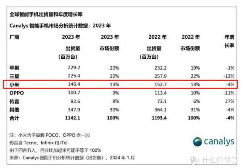 它就是小米,2023年小米全球销量为1.464亿台,而中国销量仅为3560万台,海外销量高达1.1亿台,占比达到70%左右。