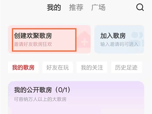 1、首先打开全民k歌,在歌房页面点击创建欢聚歌房。