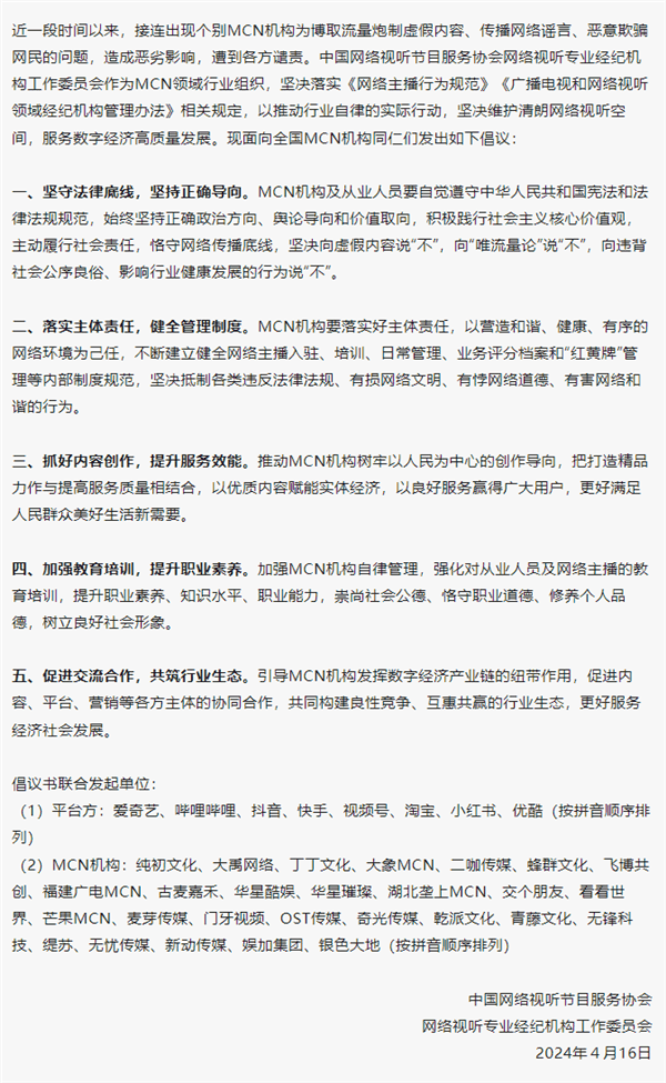 倡议书号召MCN机构及从业人员自觉恪守网络传播底线,坚决向虚假内容说“不”,向“唯流量论”说“不”,向违背社会公序良俗、影响行业健康发展的行为说“不”。