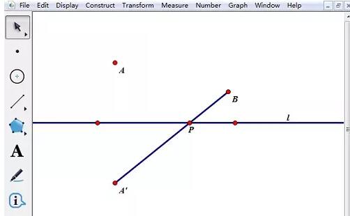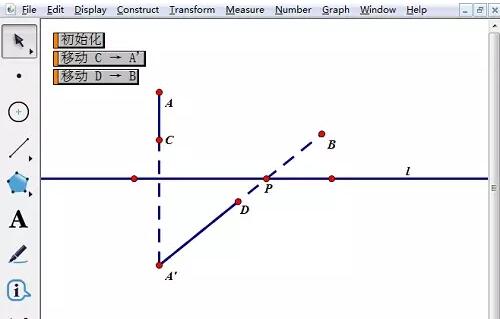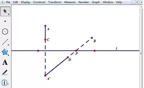 在工作区中画一条直线,任意画两个点A、B。双击直线,作为标记镜面,选择点A,【变换】——【反射】作出过点A作直线l的对称点A’,构造线段A’B与直线l的交点即为所求的点P。