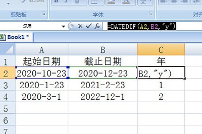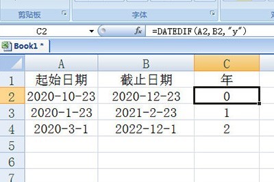 可以在年的单元格中输入以下函数=DATEDIF(A2,B2,”y”)。A2表示起始日期单元格,B2表示截止日期单元格,最后双引号中的Y表示年。