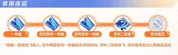 一技能在地面击飞敌人然后控制两段反向一技能继续击飞,然后空中二技能击飞敌人使用普攻触发匕首追击。