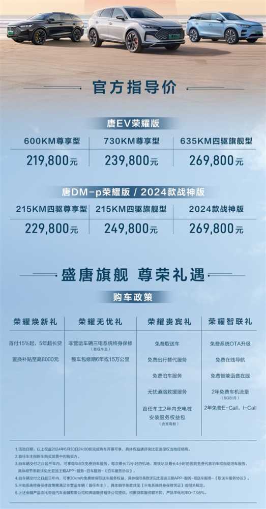 叮当号4月22日消息,比亚迪旗下中型SUV唐EV荣耀版、唐DM-p荣耀版、2024款唐DM-p战神版正式上市,共推出6款配置车型,售价区间为21.98-26.98万元,官方还推出荣耀换新礼、荣耀无忧礼、荣耀贵宾礼、荣耀智联礼,详见下图。